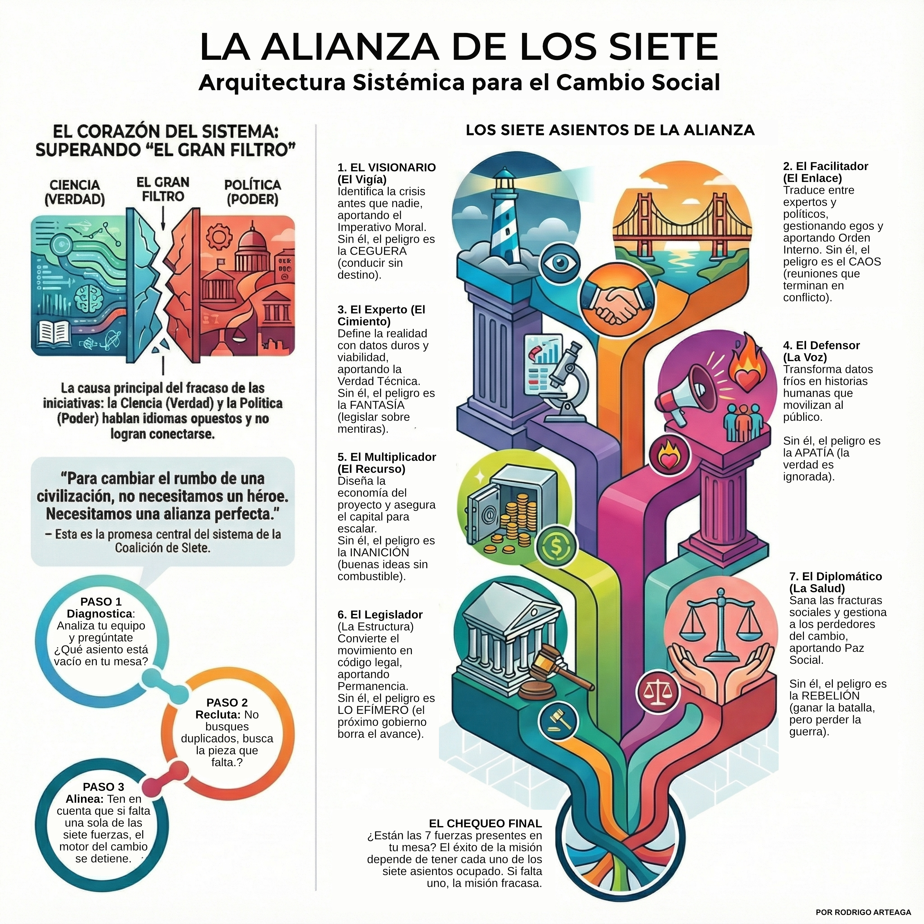 "El cementerio de la historia está lleno de ideas brillantes, datos científicos irrefutables y planes perfectos que nunca llegaron a cambiar nada. ¿Por qué? Porque tener la razón no es suficiente. Para cambiar el rumbo de una sociedad, la Verdad (Ciencia) necesita un vehículo para transitar hacia el Poder (Política). Ese vehículo es La Alianza de los Siete."